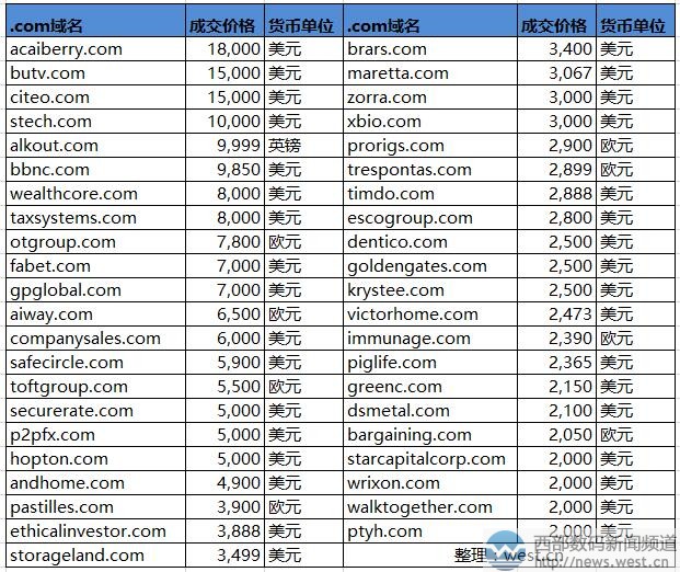 本期的.com域名中,五位数美元成交的域名只有5个。其中,排在第一的英文域名acaiberry.com是“巴西莓”的意思,学名“阿萨伊浆果”,是一个水果域名。这类域名比较适合搭建相应的水果销售网站。据了解,由于巴西莓在所有莓类里,是抗氧化功能最高的水果,经常被用在护肤方面,可作保养品。因此,Acai Berry及其相关产品风靡全球,域名acaiberry.com价值自然也不错。 排名第二的是以15,000美元结拍的四字母域名butv.com,约合人民币10万元。该域名注册于2000年,距今已有17年历史。作为CVCV型域名,BUTV.COM简单好记,而且本身是以字母“tv”结尾的,天然适合搭建视频、直播类终端,应用价值相当不错。 同样以10万元成交的还有五字母域名citeo.com,该域名表面上看并没有什么含义,但可作品牌缩写词,可搭建相应官网。据whois信息查询,域名citeo.com已被一家法国生物科技公司收购,官网域名为ecoemballages.fr。 紧随其后的是域名stech.com,成交价大概是人民币11万元的样子。在英文中有“硬塞、狼吞虎咽地吃”等含义,可搭建美食类终端。另外,据搜索发现,目前域名stech.com与深圳市南方鸿志科技有限公司(英文简称STECH)、卓锐高科控股有限公司(stech-group.com)等相对应。