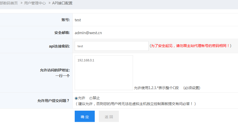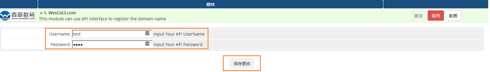 西部数码whmcs域名商注册插件安装说明1. 下载插件到指定目录 (WHMCS根目录/modules/registrars/west263) 下载地址: http://downinfo.myhostadmin.net/doc/west263forwhmcs_utf8.zip?aaaaaaaa 图示: 2. 激活并设置插件 进入WHMCS管理后台,在【系统设置】-【产品设置】-【域名注册商】中选择西部数码,“激活”并进行API接口参数配置 图示: 3. 设置代理用户名和密码,并将服务器ip添加到"允许访问的ip"中 图示:
