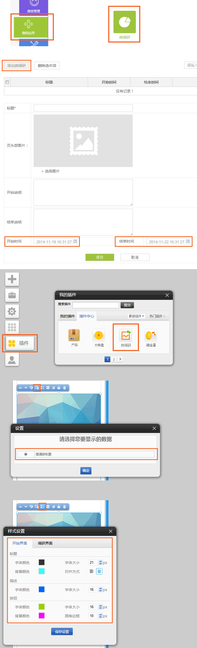 后台:可以添加多个调研活动,自由编辑调研题目,可设定调研开始和结束时间,查看调研统计结果前台:插件中心,新增微调研插件可选择使用哪个调研活动数据 可设置调研开始和结束界面样式