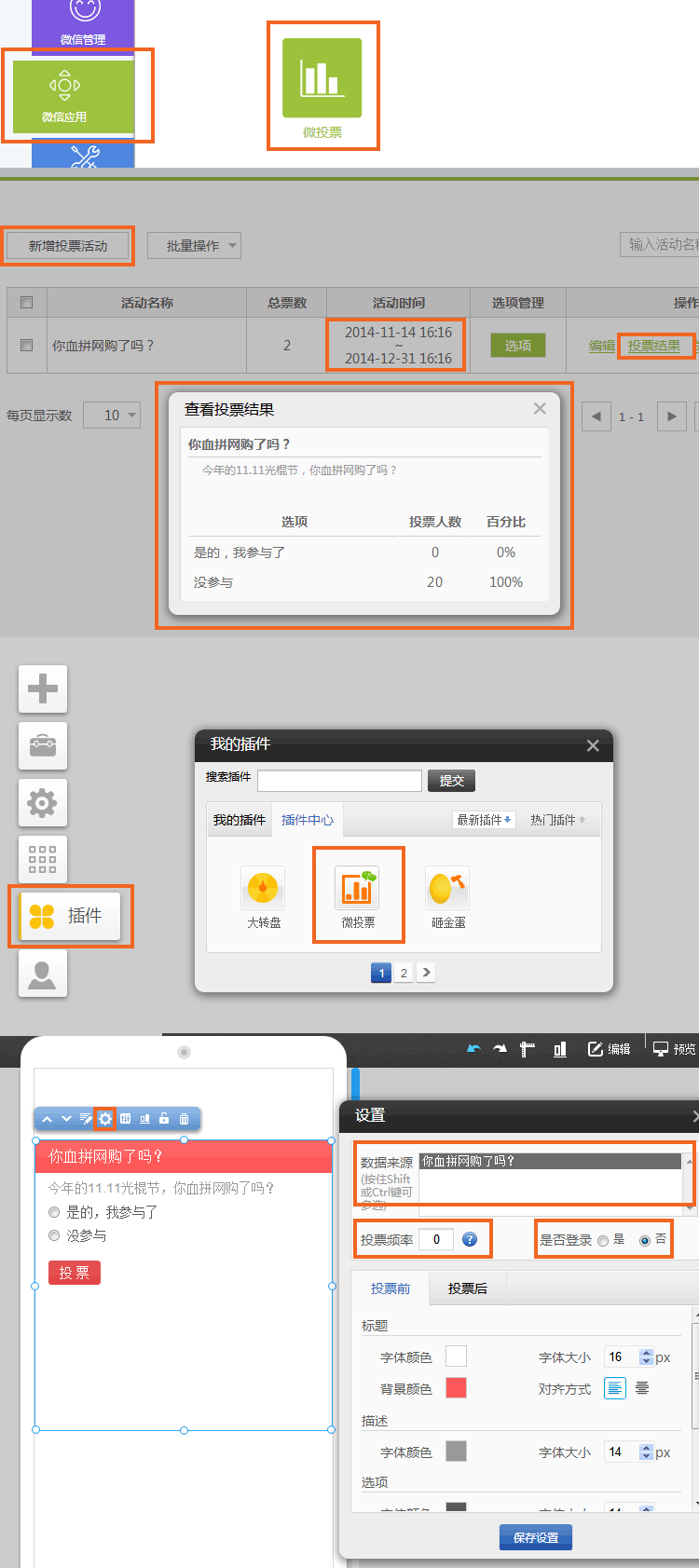 后台:可以添加多个投票活动,自由编辑投票选项内容,控制投票开始和结束时间,查看投票结果前台:插件中心,新增微投票插件。可以选择多个投票活动数据,可控制投票频率,是否需要会员登录可设置投票前投票后的显示样式