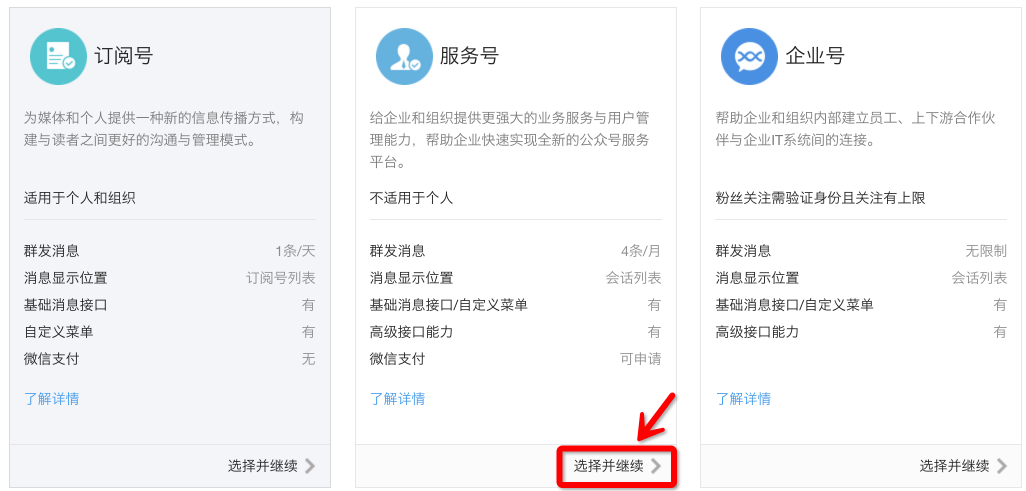 (3)选择公众号类型(订阅号/服务号/企业号) 由于微小店需要使用微信支付,因此需要注册认证的服务号。