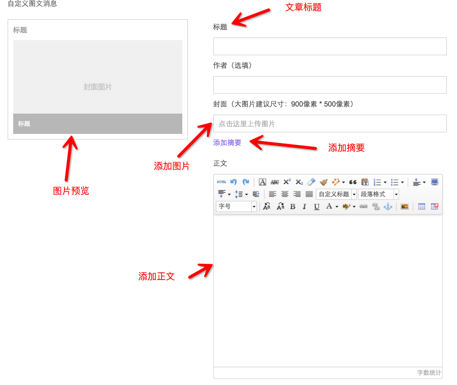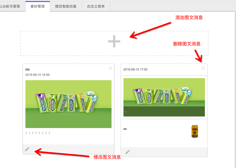 添加多图文消息的方法同添加单图文方法,只是需要添加多个单图文 2、微信智能回复微信智能回复主要包括三个方面被添加自动回复,消息自动回复,关键词自动回复 1被添加自动回复被添加自动回复指的是第一次关注该公众号将会弹出的窗口中的文字