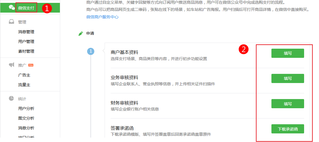 微信支付已通过微信认证的服务号可登录微信公众平台,点击“微信支付”提交资料(详细指引请参考商户服务中心),申请公众号支付功能。 申请条件完成服务号认证: 1、微信支付功能目前仅对完成微信认证的服务号开放申请(企业、媒体、政府及其他组织)。若公众帐号符合开放申请要求,可直接进入第二步(微信公众平台提交资料);