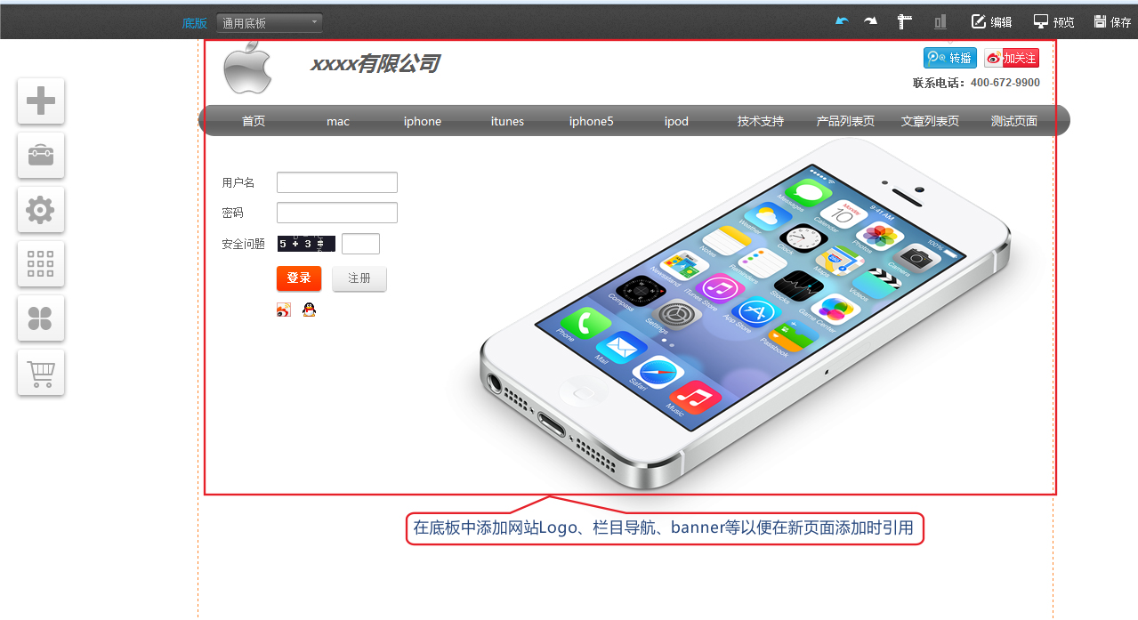 4、在底板中添加logo、banner、导航等以便在新添加的页面中引用。最后记得点击右上角的保存按钮 5、底板的应用