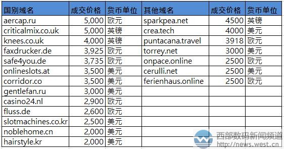 国别域名方面,本期表现平平,成交价最高的域名是俄罗斯国家域名aercap.ru,对应有荷兰爱尔开普飞机租赁公司(AerCap Holdings N.V.),其官网域名为aercap.com。小编猜测,没准就是AerCap公司收购保护了域名aercap.ru。 其他域名方面,新顶级域名表现可圈可点,本期共有4个新后缀上榜。其中,crea.tech以4000美元的价格成交,该域名对应很多缩写词,比如加利福尼亚不动产协会(California Real Estate Association),另外血肌酐也与之对应。除此以外,puntacana.travel(地名:达加纳)、onpace.online(步伐)、ferienhaus.online(大厦)等域名均超2500美元成交。 本文转载自新闻资讯,原文链接:Sedo交易榜:“本地媒体”超12万元成交! 4个新顶级域名上榜