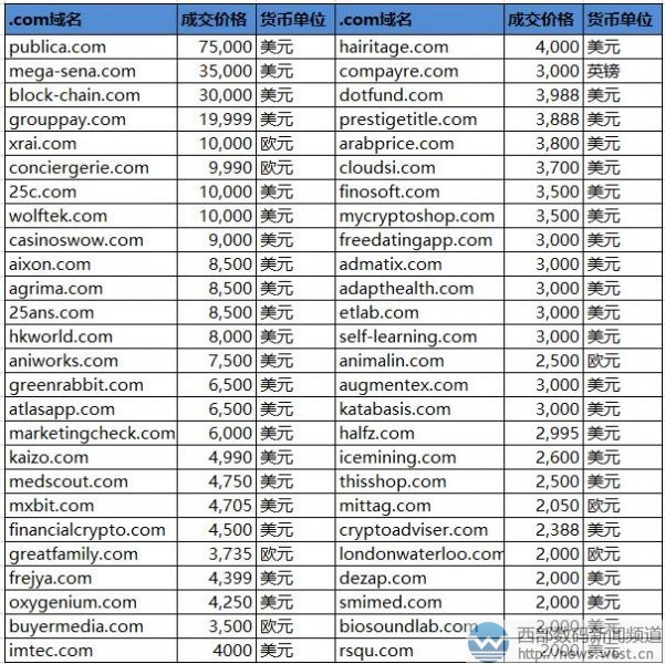 “国民”域名以49万元登顶Sedo榜! .store等新顶级榜上有名西部数码(west.cn)1月10日消息,国外sedo平台刚刚发布了新一期交易榜,本期共有71个域名超2000美元成交。其中,名列榜首的是英文单词域名publica.com,成交价为75,000美元,约合人民币49万元。