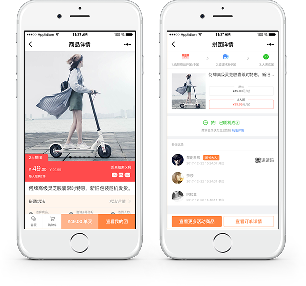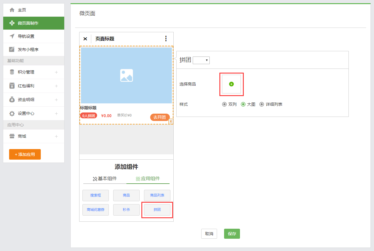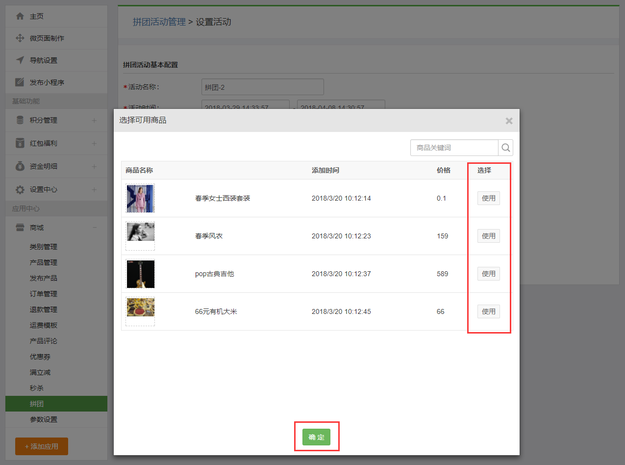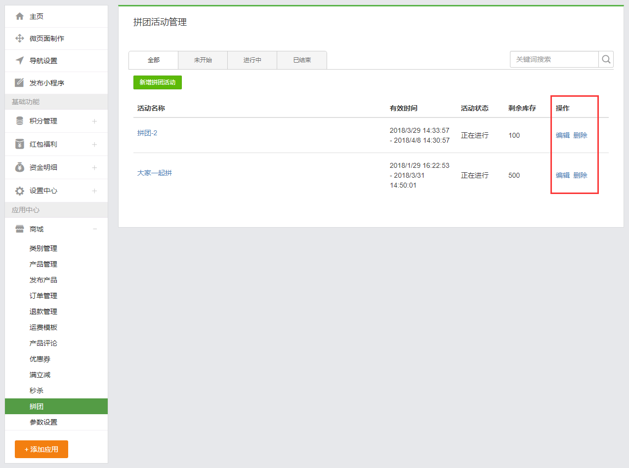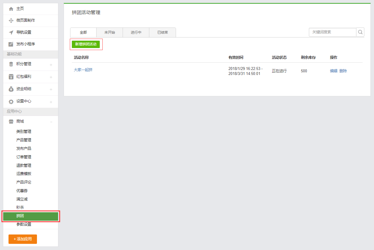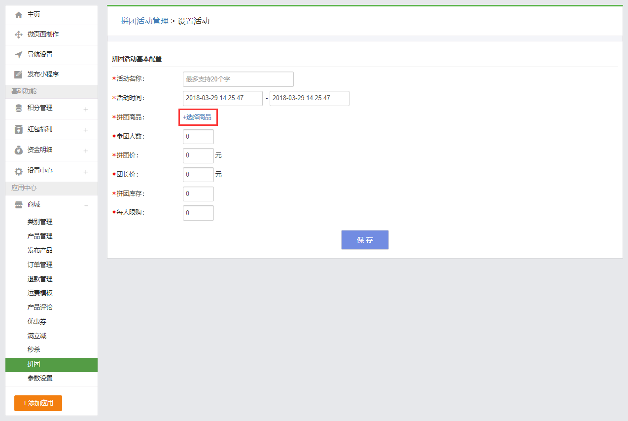拼团拼团一、功能说明“拼团”功能是由商家针对特定商品,在约定时间内,以成团人数为条件,用优惠价格出售商品的营销活动。商家可在后台自行设置拼团商品、拼团价格、活动时效、参团人数及活动商品限购等信息。通过鼓励买家发起拼团,邀请好友以折扣价格购买优质商品,同时给店铺带来更好的传播效果。 二、操作步骤步骤一:设置拼团活动 1、在小程序管理后台,点击“商城-拼团”进入拼团页面进行添加和编辑; 2、点击【新建拼团活动】按钮跳转到拼团活动基本配置页面,填写基本参数; 3、点击【选择商品】按钮,在弹出的弹框中选择已发布的商品,若还未发布任何商品, 请点击“商城-发布产品”在该页面发布产品(具体操作步骤详见产品发布与管理); 4、填写完参数之后和选择好商品之后,点击【保存】按钮,即可查看到刚刚创建好的拼团活动,还可对该拼团活动进行编辑和删除的操作。 步骤二:在微页面里面添加拼团组件1、当创建好拼团活动后,如何让它显示在小程序中呢? 这时候就需要用到 微页面里面的拼团组件。当用户开通商城应用后,在应用组件里面会自动生成拼团组件。 2、对该微页面设置好可进入的链接或者添加该微页面作为底部导航就可在小程序里查看到添加的拼团活动了,在小程序里面的效果如下图: 关于限购:“每人限购”计算的是单个买家在活动时间内最多购买的总数量(不限团购次数),而不是单次最多购买的数量。例如设置每人限购5,如果买家第一次购买了3件,则第二次最多只能购买2件;如果第一次购买了5件,则第二次就不能购买了。