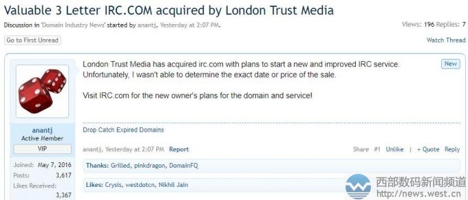 身价六位数美金?伦敦信托媒体收购三字母域名IRC.com6月25日消息,据国外米友在Namepros上曝料称,三字母域名IRC.com日前被英国媒体公司London Trust Media Holdings(伦敦信托媒体控股公司)收购。外媒猜测,域名IRC.com可能达六位数美金。