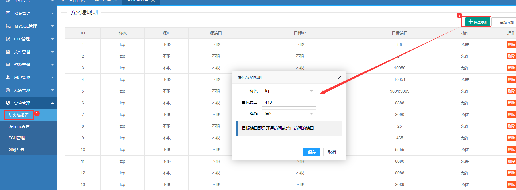 (2)2.5版本 登录wdcp后,点击“安全管理”——“防火墙(iptables)”——增加规则