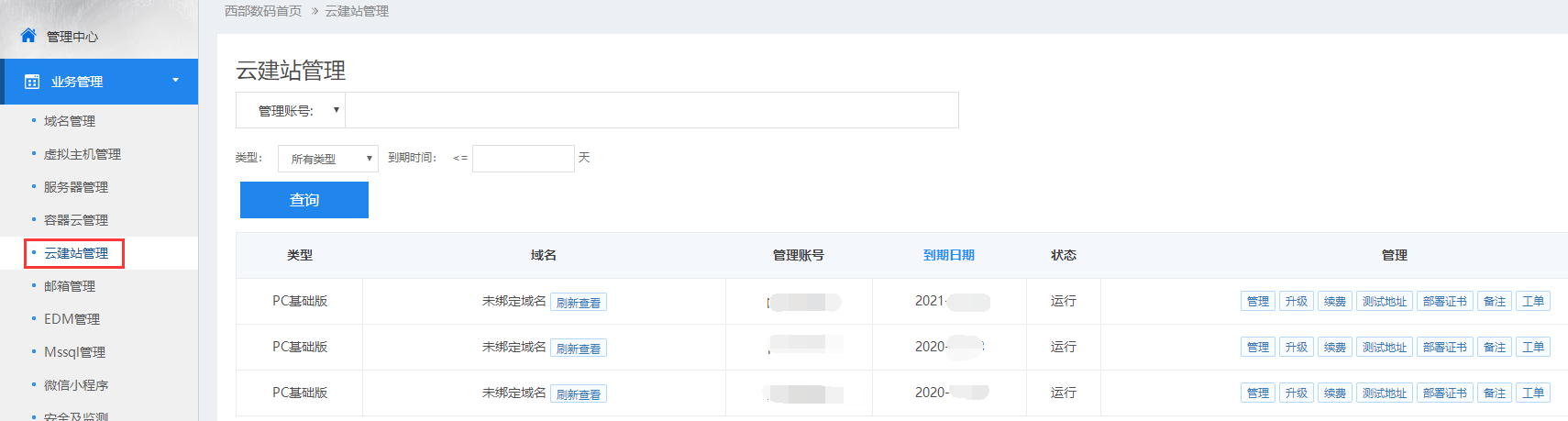 【云建站入手教程】3、云建站管理界面介绍快捷导航: -------【云建站入手教程】-------- -------【云建站入手教程】-------- 云建站购买后请登录会员中心,点击左侧业务管理中的“云建站管理”。点击管理按钮可进入对应的云建站产品界面。
