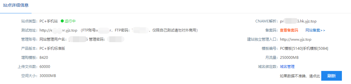 管理界面下部是云建站的基本信息,其中包含后台信息,管理用户名密码等。重点信息如下: 1、管理账号密码:您可以通过登陆地址,www.yjz.top,输入管理用户名和管理密码进行登录编辑,无需每次都登陆我司后台操作。 2、备案码:可点击红色文字查看备案码 3、测试地址:一般为proxxxxx.yjz.top,用以在备案前临时访问,访问时请输入FTP名和密码打开。