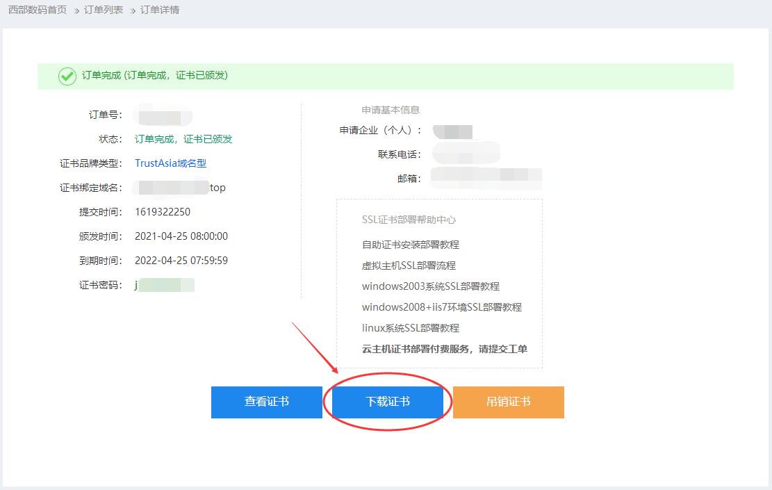 3.选择PEM格式,适合nginx的,然后点击下载。因为下载是rar的压缩包,因此请记住解压密码,下载后需要用密码进行解压。