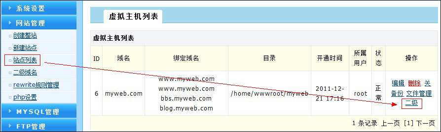 最后点击确定,就建立好了一个二级域名的站点。 wdcp3.2版本: 首先登录WDCP管理面板,点击左侧的“网站管理”——“站点列表”,在站点列表选择您要绑定二级域名的站点,点击右侧的“二级”,如图: