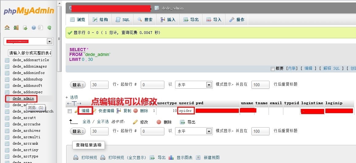 登陆以后查看dede_admin表里面的用户是否被篡改为spider 点击编辑,直接将spider修改为您需要的管理员,pwd替换为962ac59075b964b07152,这个密码是123,更改以后请及时登陆网站后台进行修改密码。