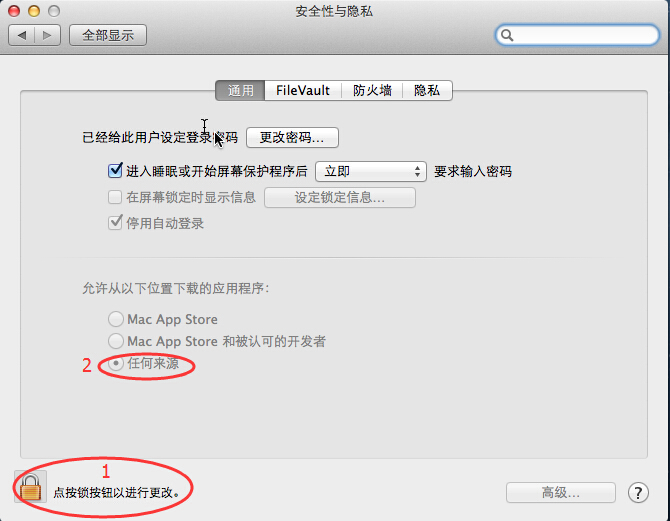 若安装时提示“您的安全性偏好设置仅允许安装来自 Mac App Store 和被认可的开发者的应用程序。” 请依次打开“系统偏好设置”——“安全性与隐私”。点击左下角的锁,输入管理员密码解锁后, 在“允许从以下位置下载的应用程序”后选择“任何来源”,即可正常安装该软件。如图: