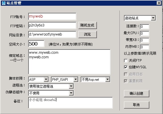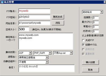 1. 网站管理:一键添加网站(IIS)、添加网站FTP、自定义网站目录、创建MySql数据库、自定义网站支持脚本(如:asp/php/asp.net)、站点权限独立设置。